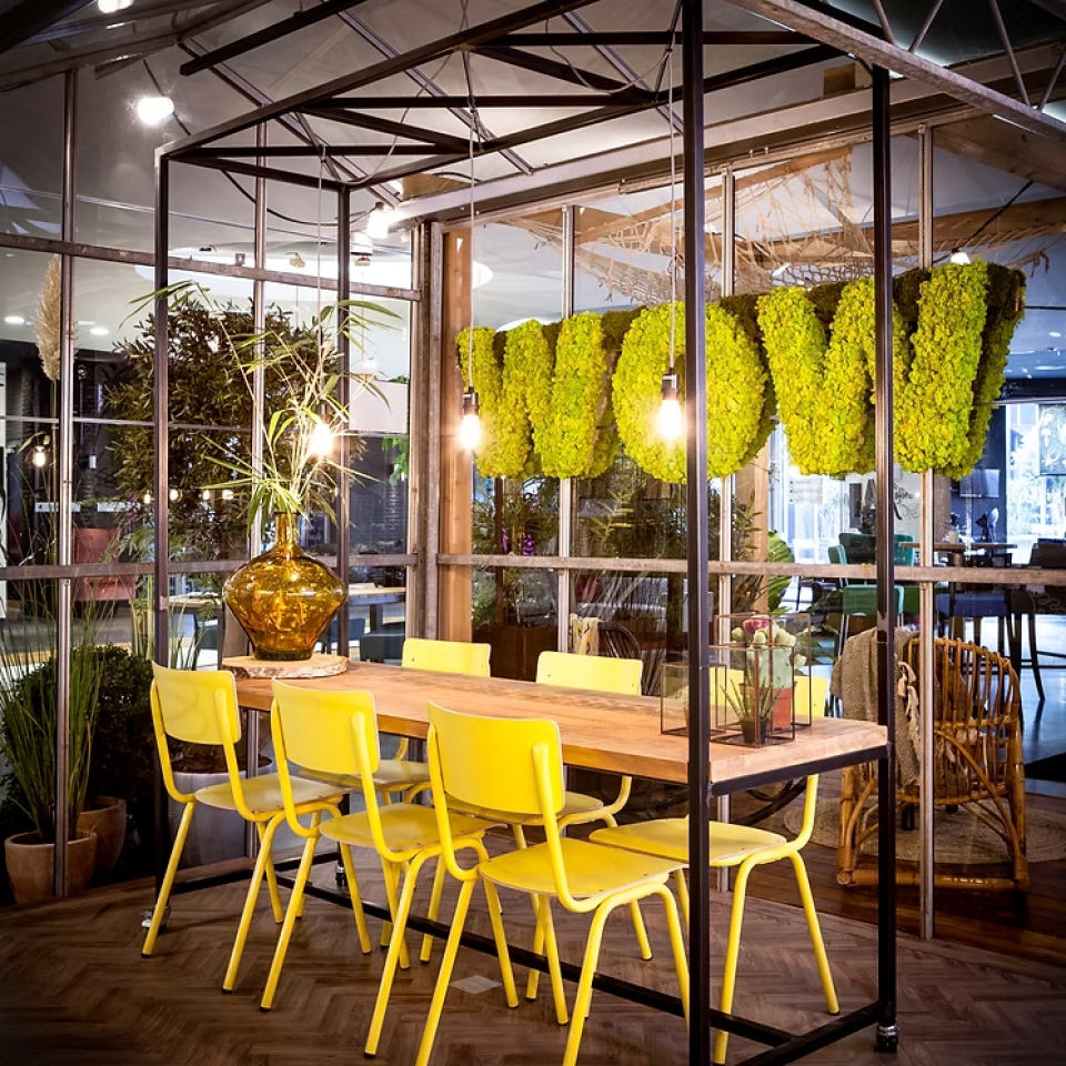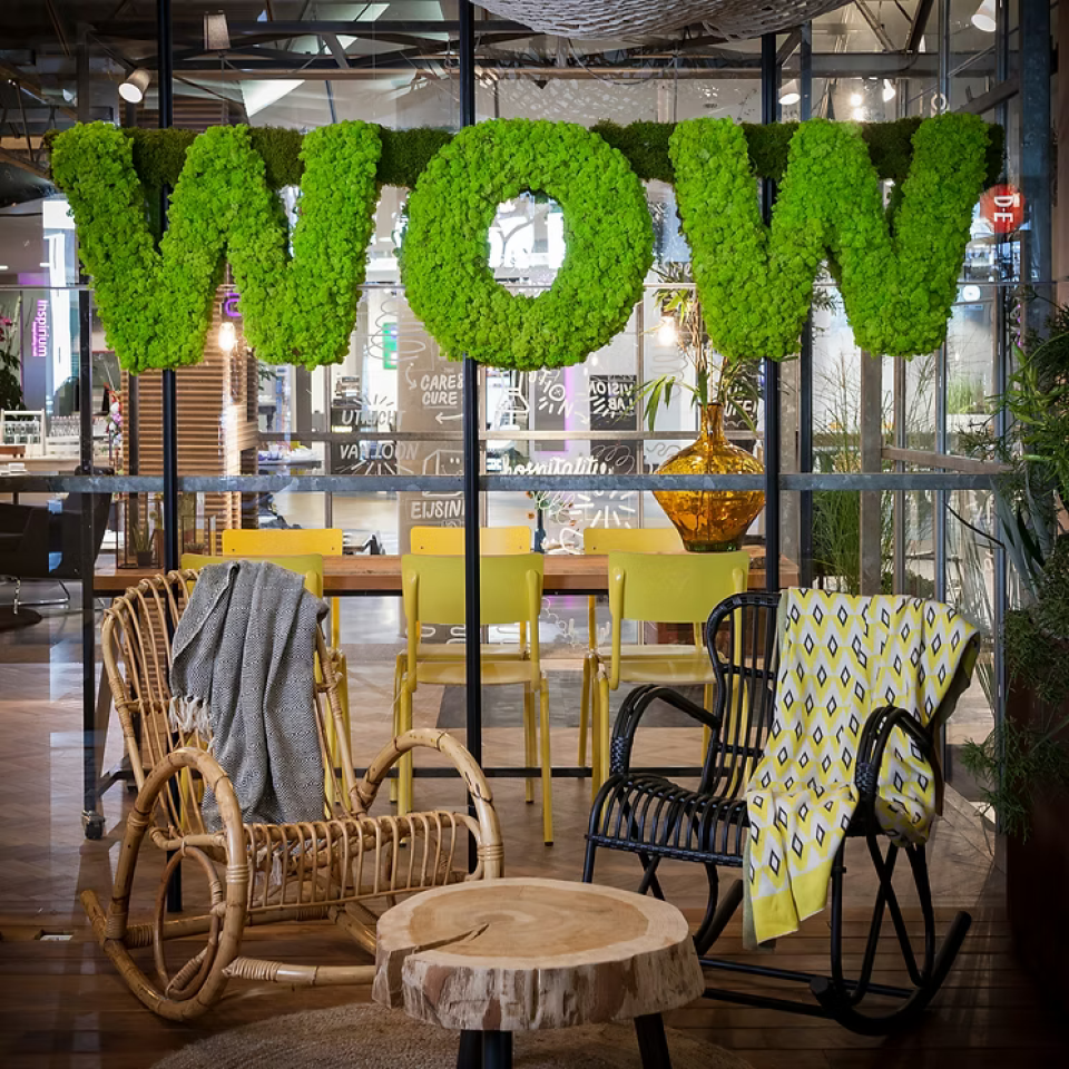 • groen verwerkt in mosletters en maatwerkverlichting
