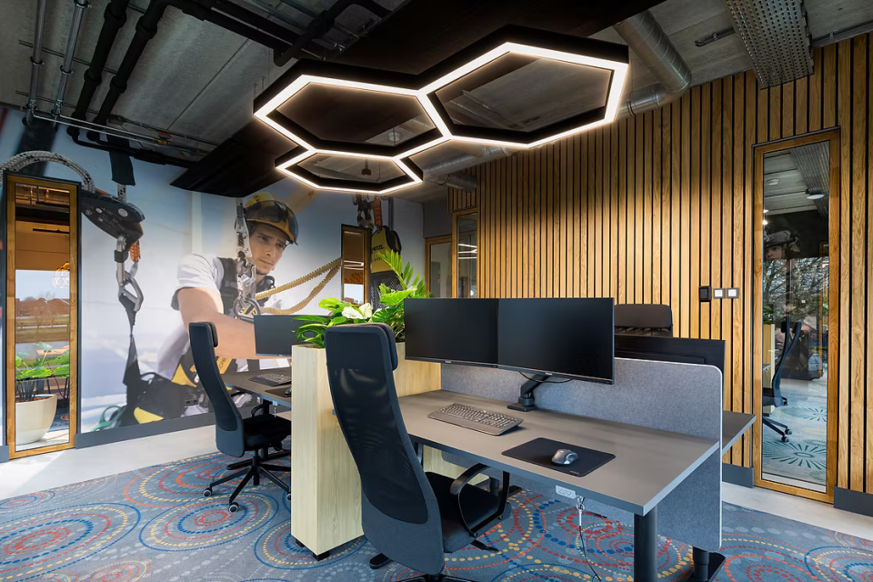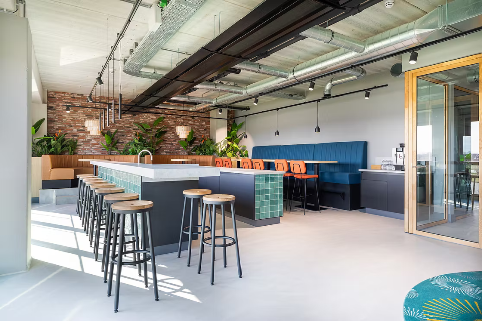 Het ontwerp combineert zichtbaar beton en open installaties met natuurlijke materialen en kleuraccenten. Grote raampartijen halen daglicht en landschap naar binnen en maken de buitenbeleving onderdeel van de werkdag.