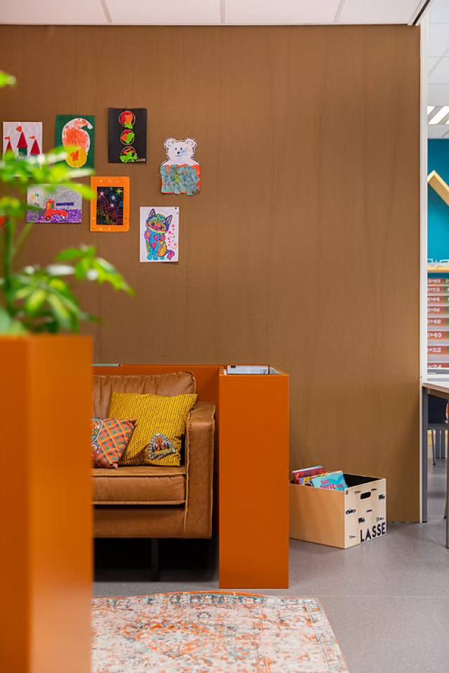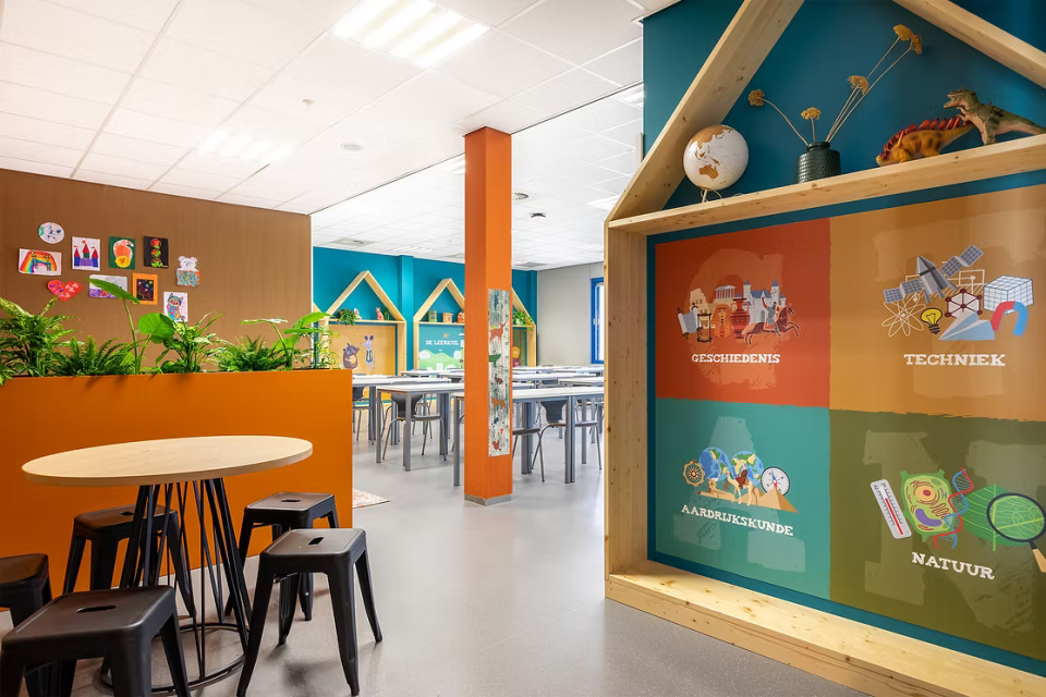 • basisschoollokaal met warme, kleurrijke en geborgen uitstraling